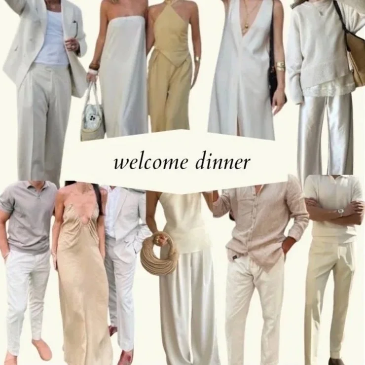 For the Welcome Dinner, the dress code is “Dressy Casual” in whites, creams, nudes, or light tans—white party meets French countryside. For men, think linen pants and button up and/or jacket. For women, think dresses, flowy skirts or pants.